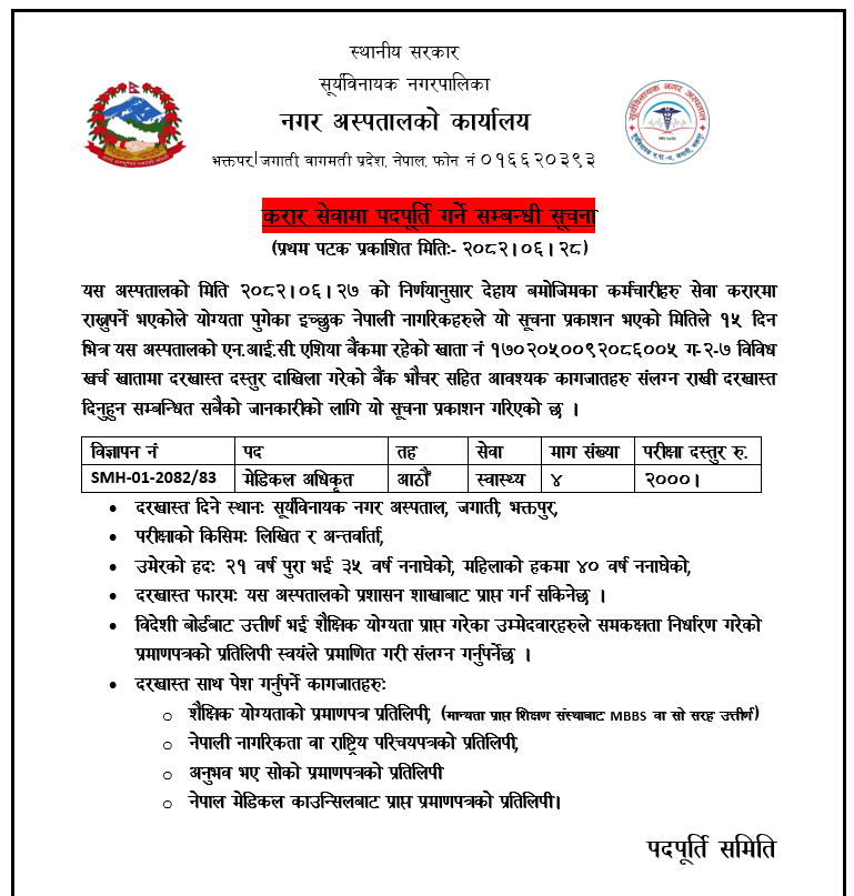 नगर अस्पतालका लागि मेडिकल अधिकृत करार सेवामा पदपूर्ति सम्बन्धी सूचना !