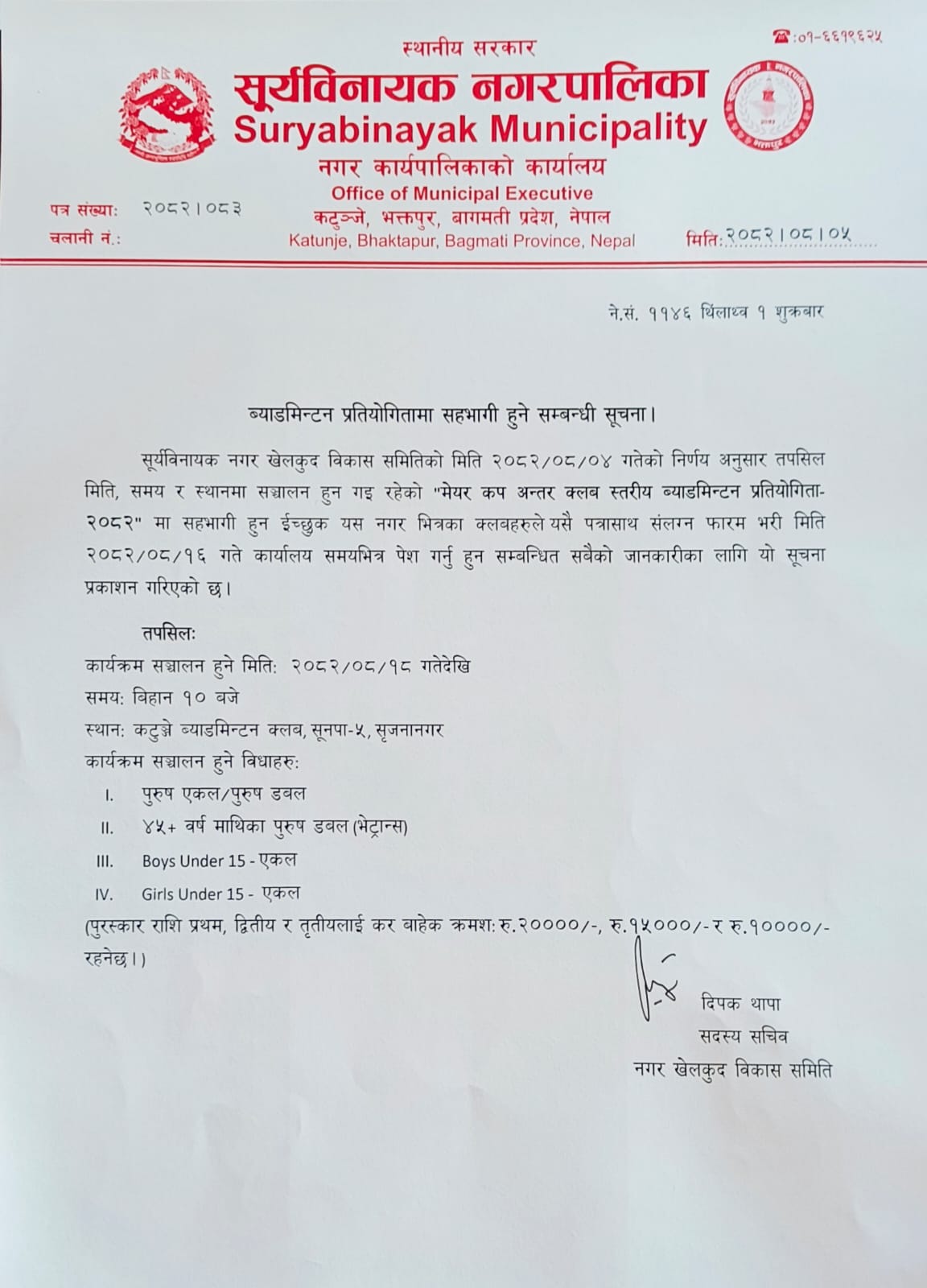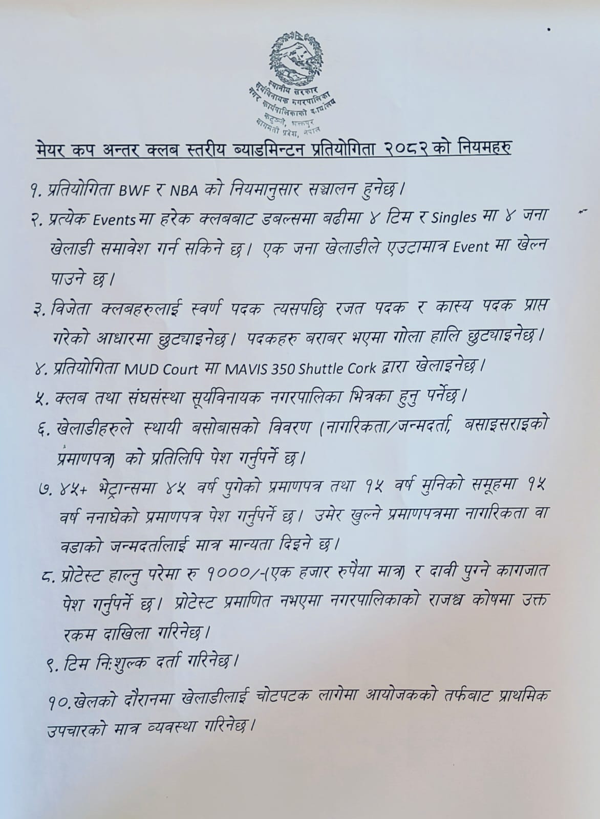 मेयर कप अन्तर क्लब स्तरिय ब्याडमिन्टन प्रतियोगिता २०८२ संचालन सम्बन्धी सूचना !!!