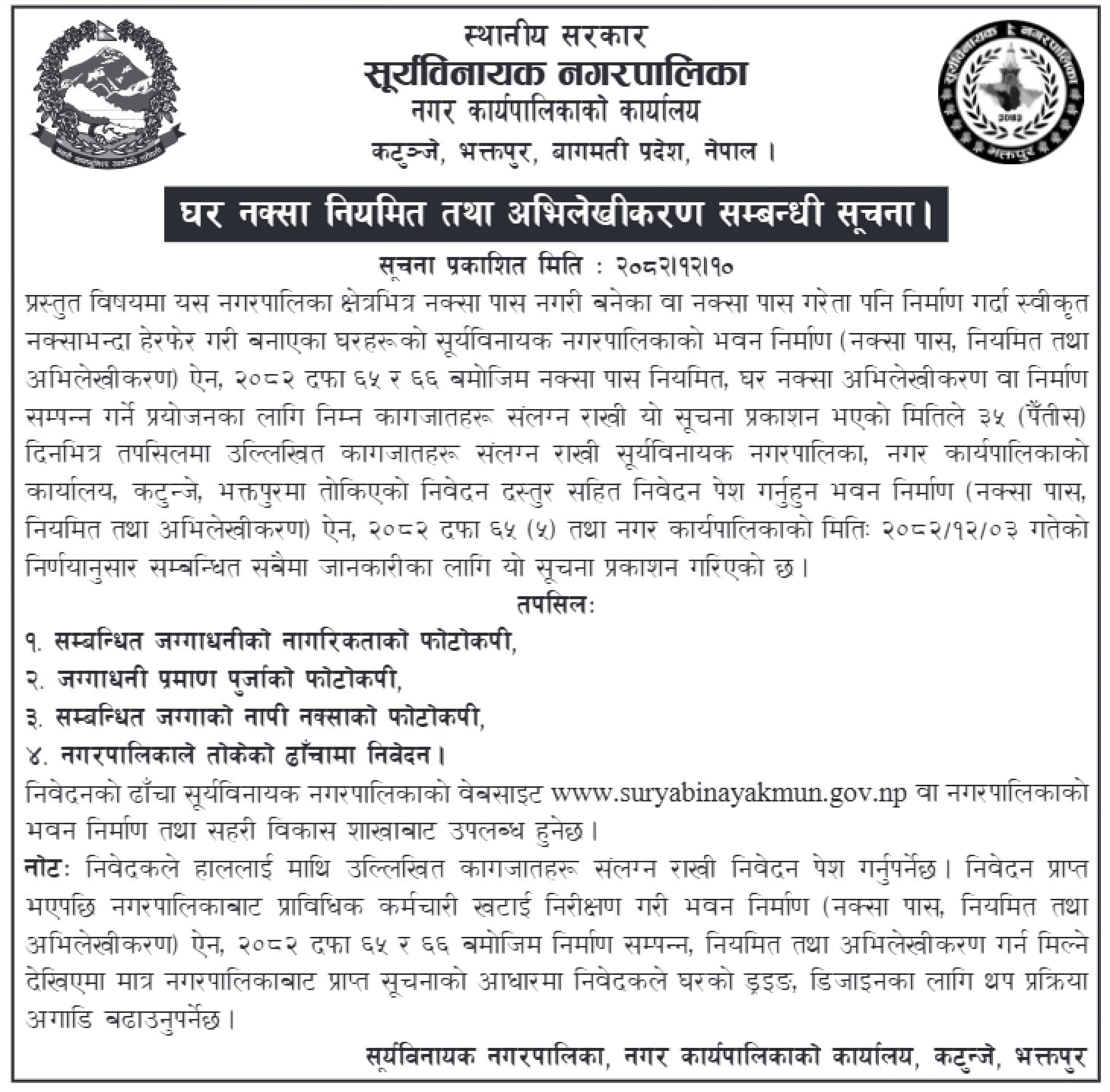 घर नक्सा नियमित तथा अभिलेखीकरण सम्बन्धी सूचना । सूचना प्रकाशित मिति : २०८२/१२/१०