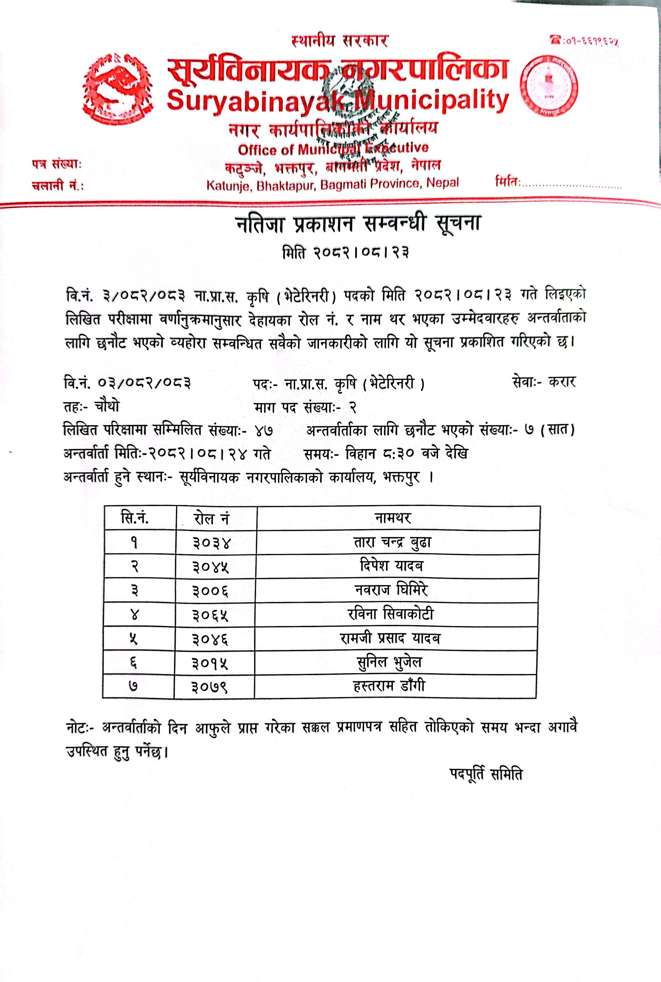 नतिजा प्रकाशन सम्बन्धी सूचना । (ना.प्रा.स. कृषि) २०८२/०८/२२