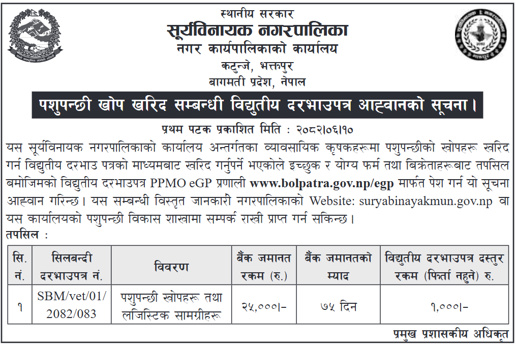 » पशुपन्छी खोप खरिद सम्बन्धी विद्युतीय दरभाउपत्र आह्वानको सूचना !