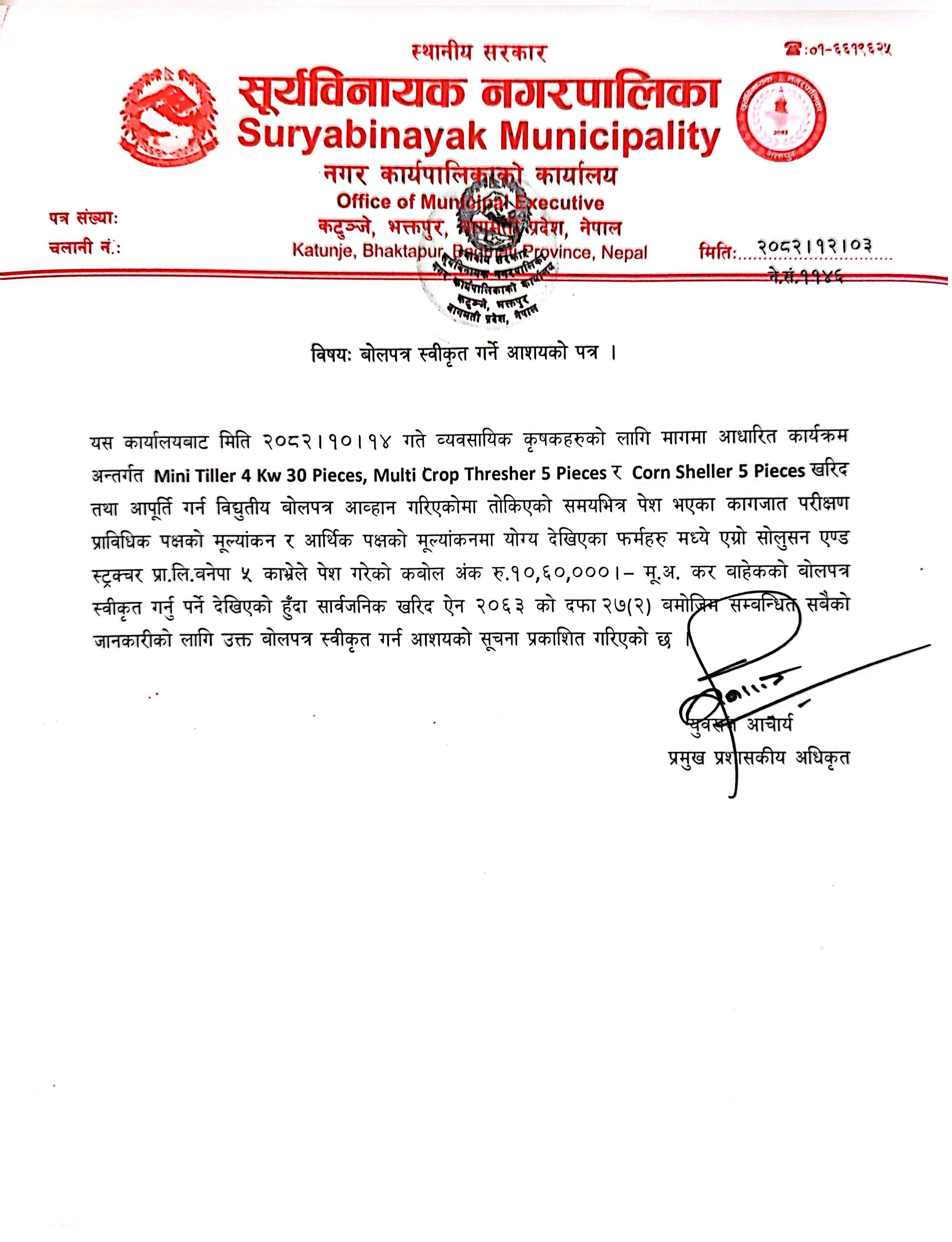 मिनि टिलर, थ्रेसर तथा कन्सेलर खरिदका लागि आह्वान भएको बोलपत्र स्विकृतिका लागि आशयको सूचना !!!