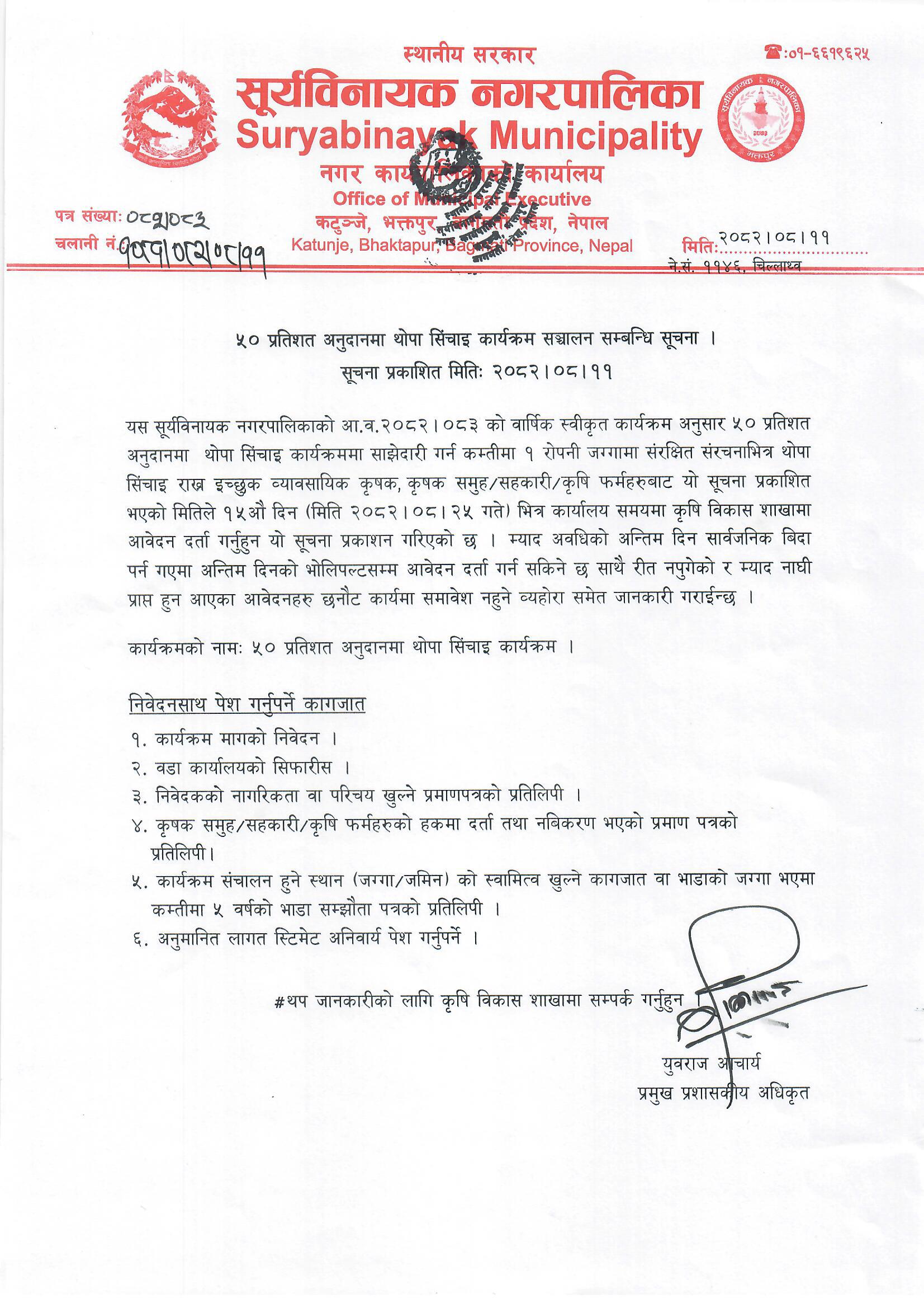 ५० प्रतिशत अनुदानमा थोपा सिंचाइ कार्यक्रम सञ्चालन सम्बन्धि सूचना । सूचना प्रकाशित मितिः २०८२।०८।११