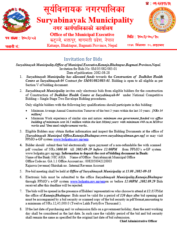» दधिकोट स्वास्थ्य चाैकी निर्माण सम्बन्धी बोलपत्र आह्वानको सूचना !!!