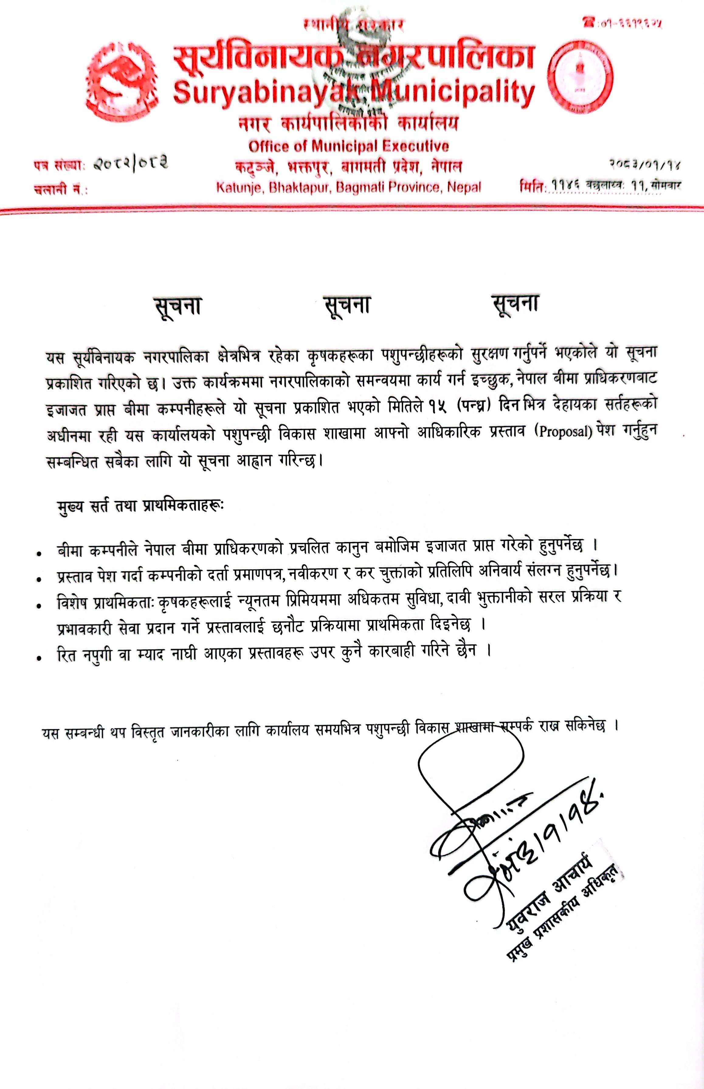 पशु सुरक्षण बिमाका लागि प्रस्ताव आह्वानको सूचना !