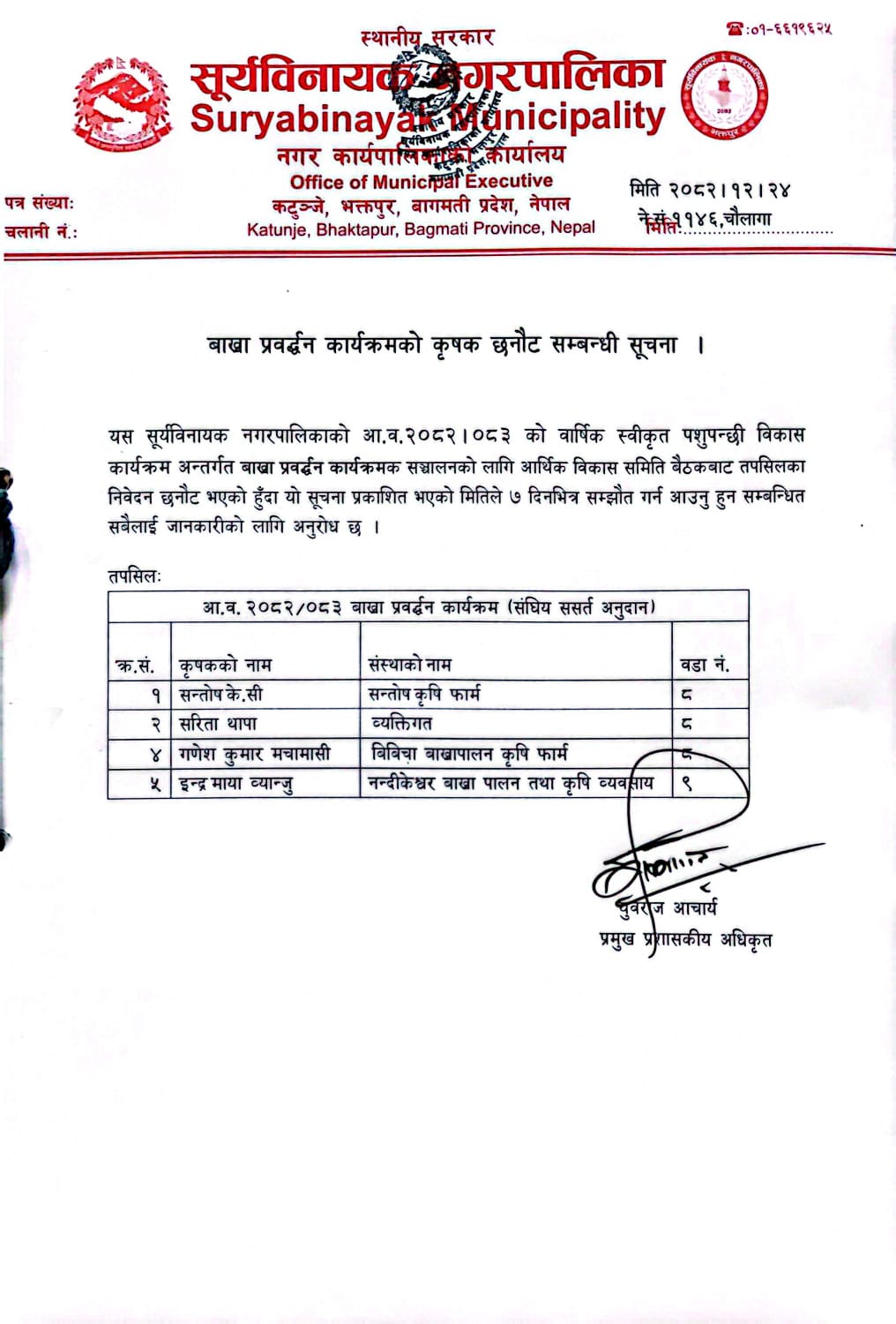 » बाख्रा प्रवर्द्धन कार्यक्रमको कृषक छनाैट सम्बन्धी सूचना !
