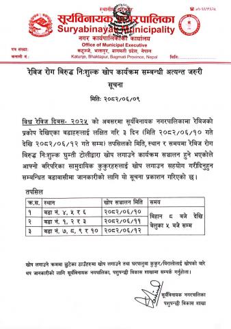 रेबिज रोग बिरूद्धको निःशुल्क खोप कार्यक्रम मिति २०८२/०६/१० देखि १२ गते सम्म सञ्चालन हुने सम्बन्धी सूचना !!!