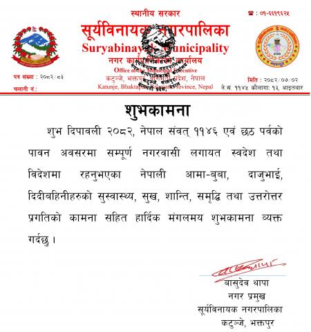 शुभ दिपावली २०८२, नेपाल संवत् ११४६ एवं छठ पर्वको पावन अवसरमा सम्पूर्ण नगरवासी लगायत स्वदेश तथा विदेशमा रहनुभएका नेपाली आमा–बुबा, दाजुभाई, दिदीबहिनीहरुको सुस्वास्थ्य, सुख, शान्ति, समृद्घि तथा उत्तरोत्तर प्रगतिको कामना सहित हार्दिक मंगलमय शुभकामना ।