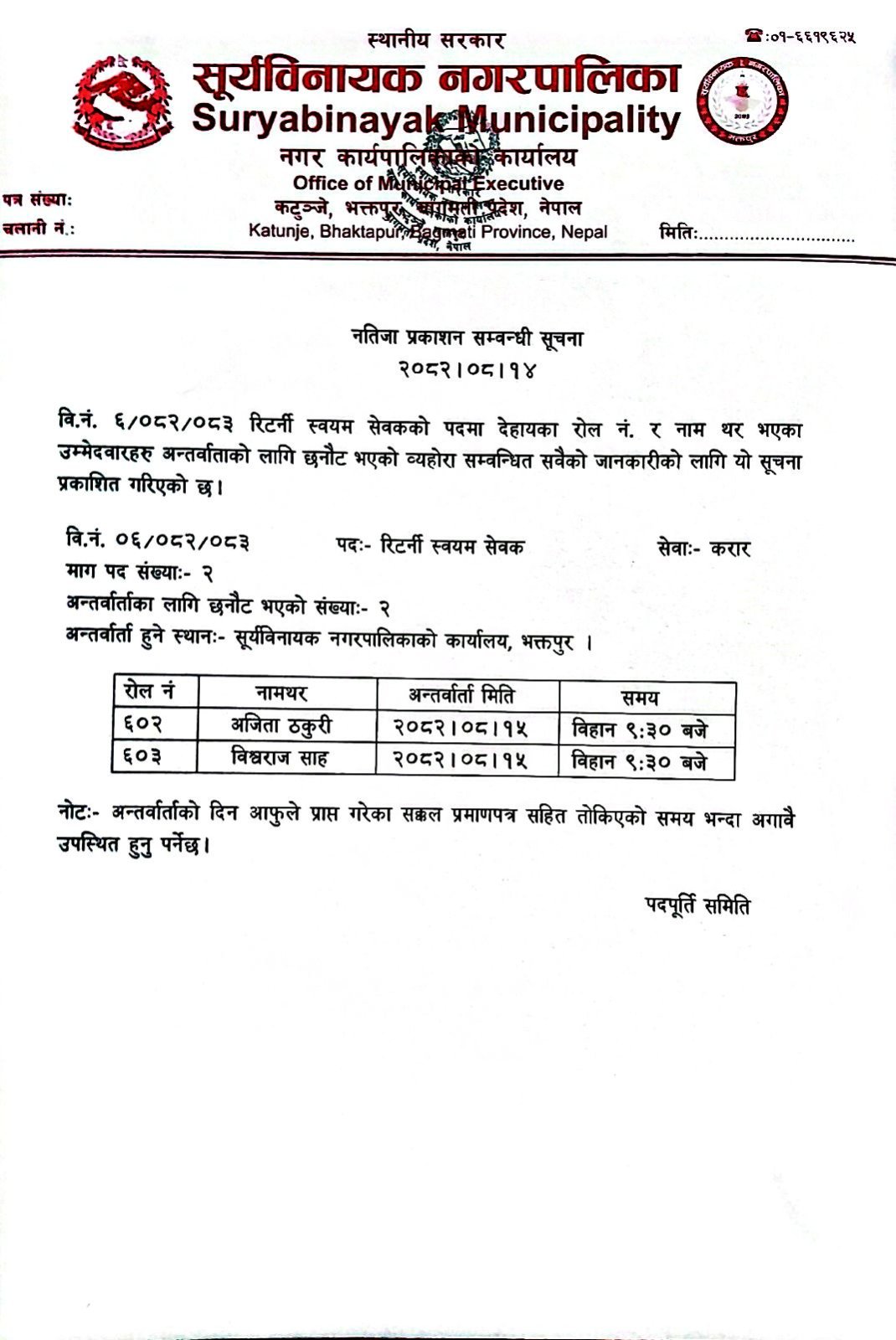 अन्तर्वार्तामा सहभागी हुने सम्बन्धी सूचना !!! (मनोसामाजिक परामर्शकर्ता) २०८२/०८/१४