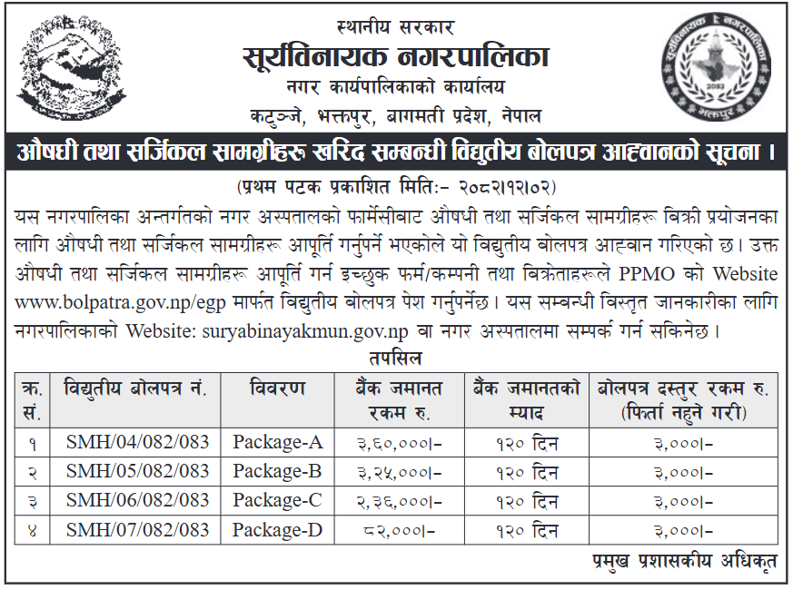 औषधी खरिदका लागि बोलपत्र आह्वानको सूचना !!!