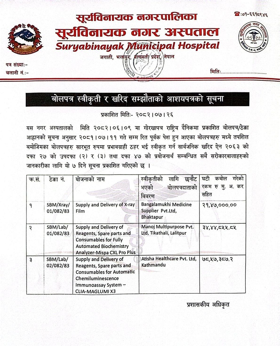 बोलपत्र स्वीकृती र खरिद सम्झौताको आशयपत्रको सूचना । २०८२/०७/२६