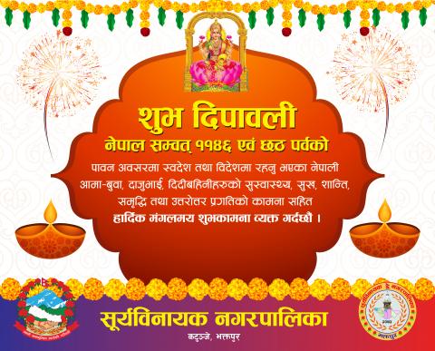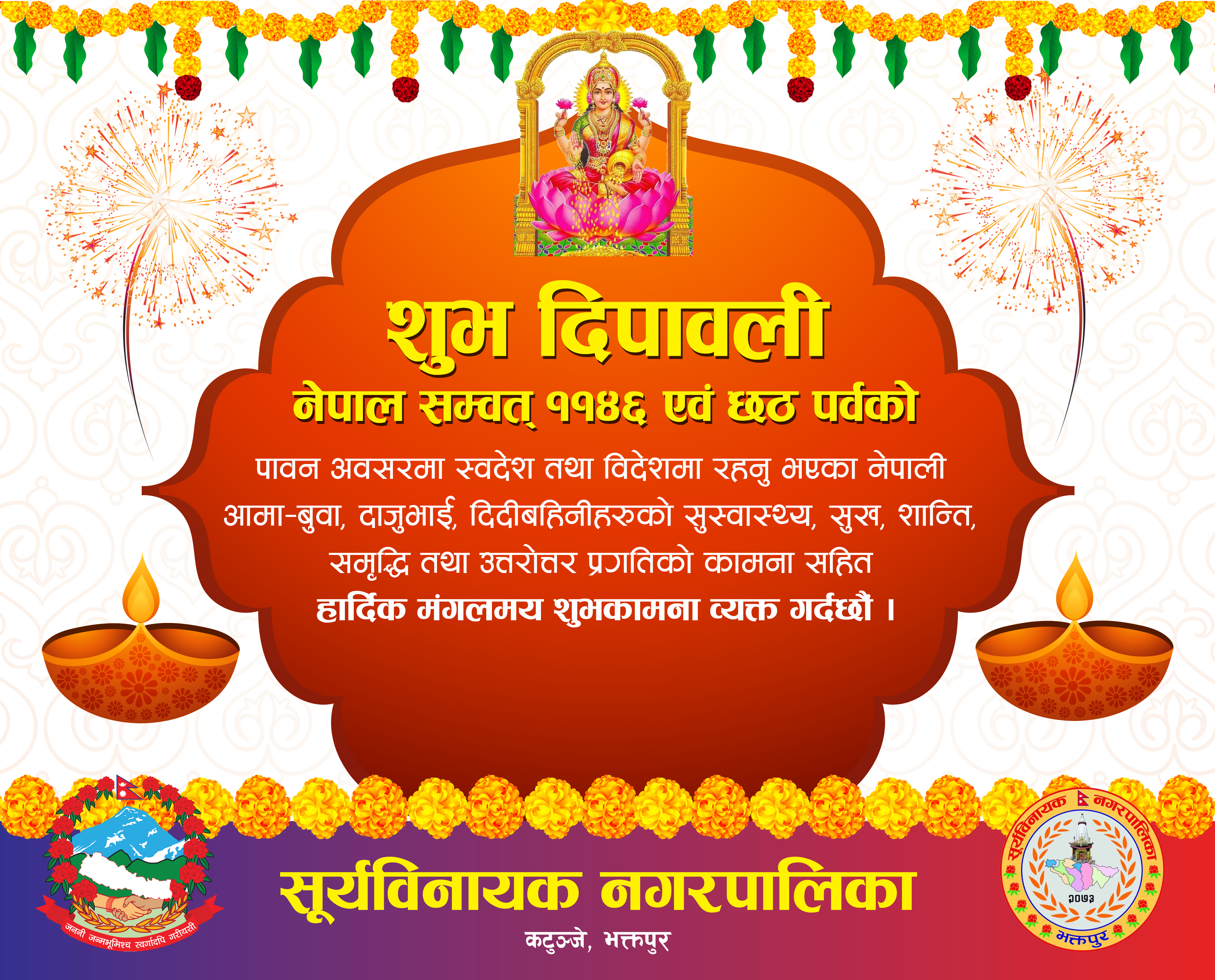 Home » शुभ दिपावली २०८२, नेपाल संवत् ११४६ एवं छठ पर्वको पावन अवसरमा सम्पूर्ण नगरवासी लगायत स्वदेश तथा विदेशमा रहनुभएका नेपाली आमा–बुबा, दाजुभाई, दिदीबहिनीहरुको सुस्वास्थ्य, सुख, शान्ति, समृद्घि तथा उत्तरोत्तर प्रगतिको कामना सहित हार्दिक मंगलमय शुभकामना ।